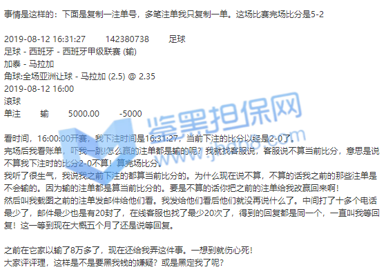 前几天在大发bet入款2000。没有申请任何优惠情况下下了几场比赛。流水妥妥的满足要求。昨晚申请取款的时候。三次被拒绝。询问之下,大发工作人员嚣张的回复了一句。你申请了首存百分50活动。我当时就呵呵了,就你这优惠15倍流水谁有这福气享受了!大发居然回复,这是你满足优惠情况下,系统自动申请的。我也是服了,你们听说过自己不申请优惠的情况下,系统自动给你申请,强制你们优惠吗。大发给的回复是我自己注册的时候自己默认优惠由系统自动派发。我玩这么久的体育就没听说过还有这样的,你们大发真是心灵手巧啊。客服当时就回复了一句你发现钱多的时候不会自己找客服吗,反正你都盈利了,多赢点有什么关系。你们说说看,这是一个大牌公司应该有的态度?然后我就问在哪里可以看到红利派彩,客户就会员看不到,他们说有就有!我耐着性子去算了一遍自己的下注流水,发现2000的本金下注的比赛输赢情况正好符合我现在账号余额,没有多余的钱于是我找客服理论。他也发现自己算错了就说了一句核查错误我再申请取款。然而第二次还是失败的!于是我在大发体育的本金就赚到沙巴体育去申请取款。还是取款失败!我再次找客服理论,大发只回复了一句我从大发体育转到沙巴体育。跨平台转账需要多1倍流水,就是还要4325的流水。我当时就懵逼了。你们公司自己的平台为什么我转账之后还要多完成一倍流水!客服就呵呵了我,说了句公司规定。公司规定,这口气就跟那些黑平台不给出款说的专员审核还有风险控管部门核实不是一个态度吗?然而大发,一个在业界享有声誉的公司,客服居然是这个态度。我就问他你们平台注册还有下注条例哪里有写明这些。客服的回答让人咂舌,他说只要公司规定就可以。退一万步说你们这规定是合理的,公司要求的。也应该写明了规则,会员需要有知情权,你们这样的说法一开始就建立在不诚信的基础上。说到这里希望吧里有在大发bet下注的朋友告知一声,是否大发自己公司内的下注平台资金转账需要多刷一倍流水!还是说我受到不公平要求!因为他们的强制要求,一开始大发在客户不知情也没有申请的情况下自动添加彩金,并且无任何详细规定写明平台转账需要多完成一倍流水,强制完成莫名其妙流水。从头到位大发bet态度就是嚣张!最后希望鉴黑担保网把这个黑网曝光,不要让更多老哥上当受骗!