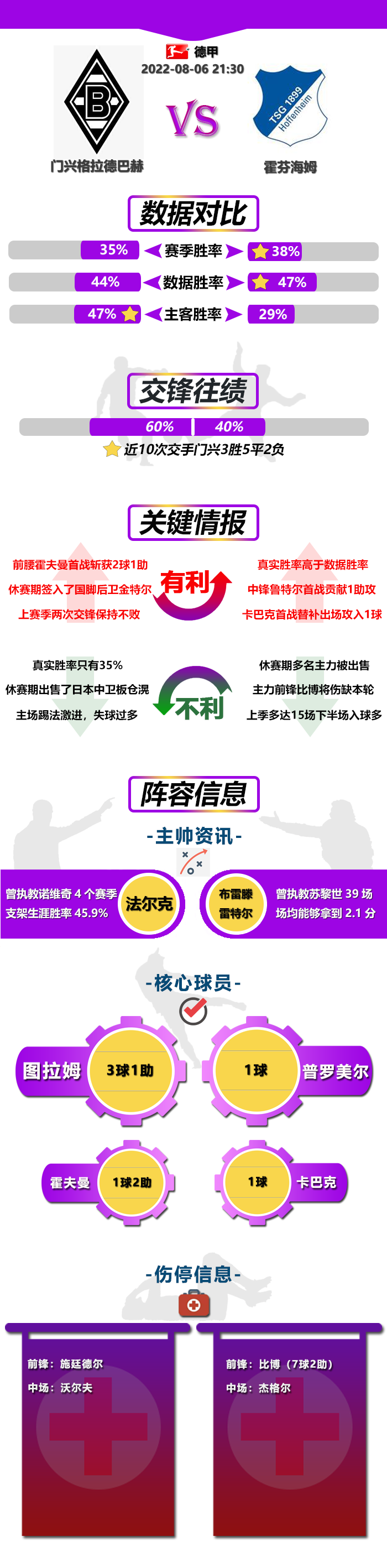 霍芬海姆上赛季同样是开局低迷,尽管开局受限于兼顾欧战的缘故,表现非常差,但他们通过调整之后,后半程迎来发力,最终还是爬回到了第九的位置,勉强顺利保级。不过休赛期他们仅仅象征式地签入了两名替补中场普罗美尔和贝克,而主力中锋克劳斯和阿达米安等多名主力球员都被卖走,整体实力大减,开局可能又会像上赛季一样。
